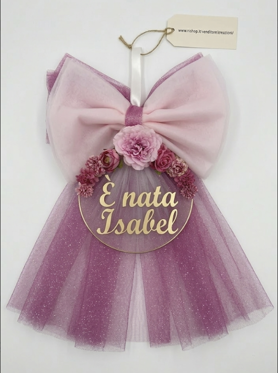 una bellissima coccarda nascita con scritta tagliata in legno ,qualsiasi colore qualsiasi misura.