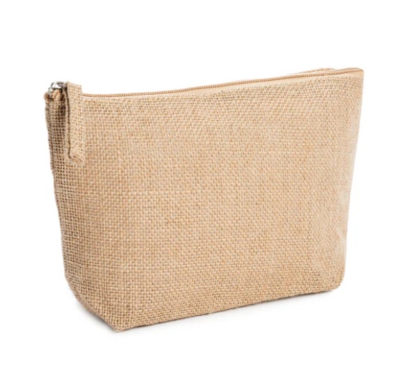 Beauty case in juta con zip in tinta e tiretto in juta.
